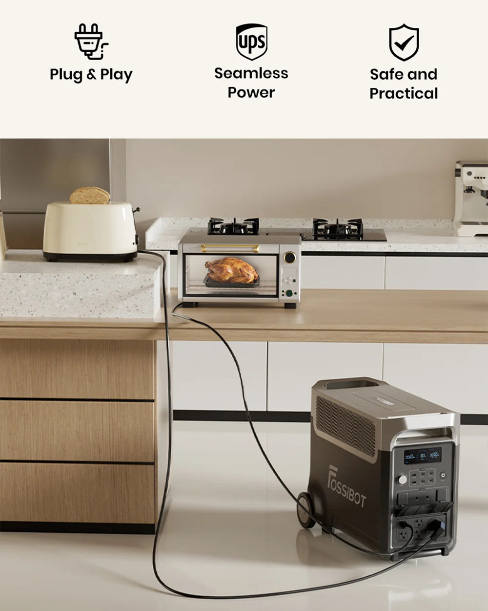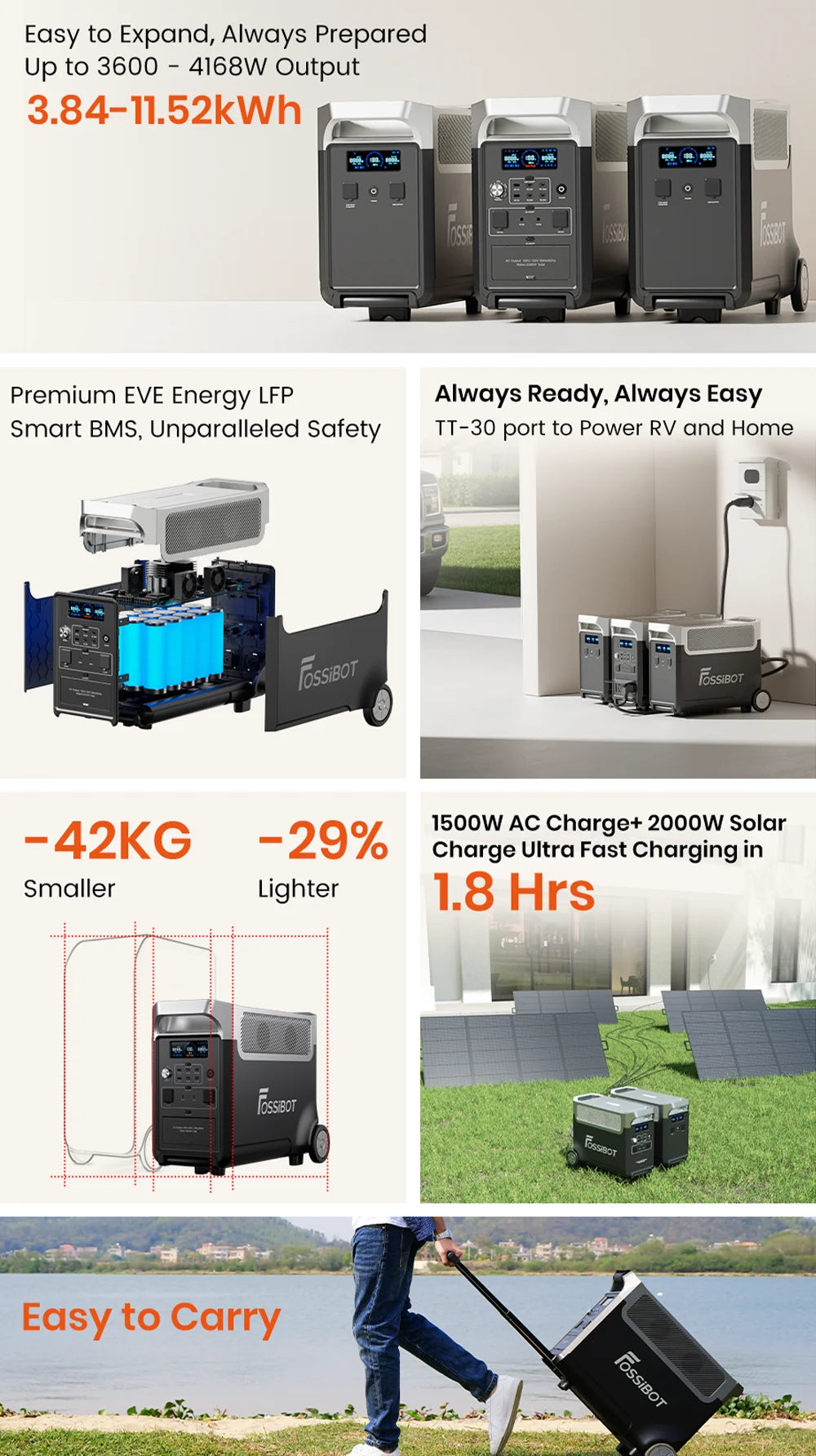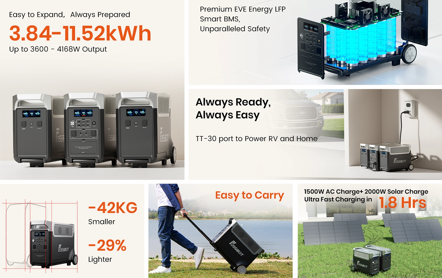 - 3.84kWh - 11.52kWh expandable capacity with up to 2 expansion batteries (FOSSiBOT FB3840) for extended power outages.