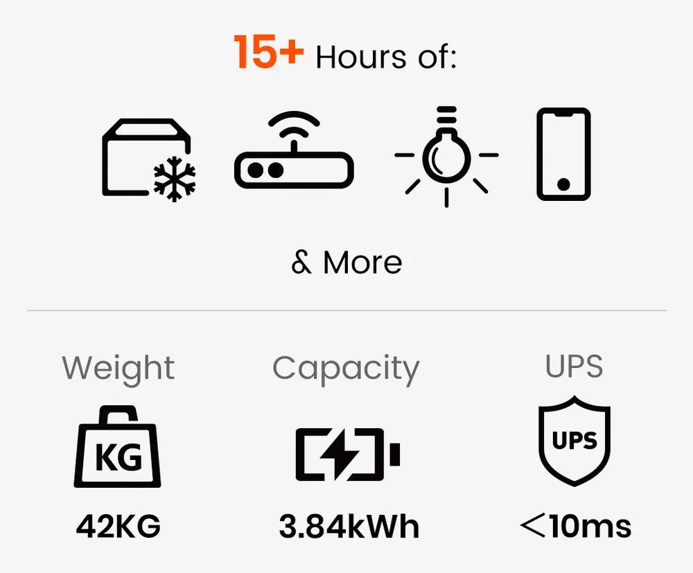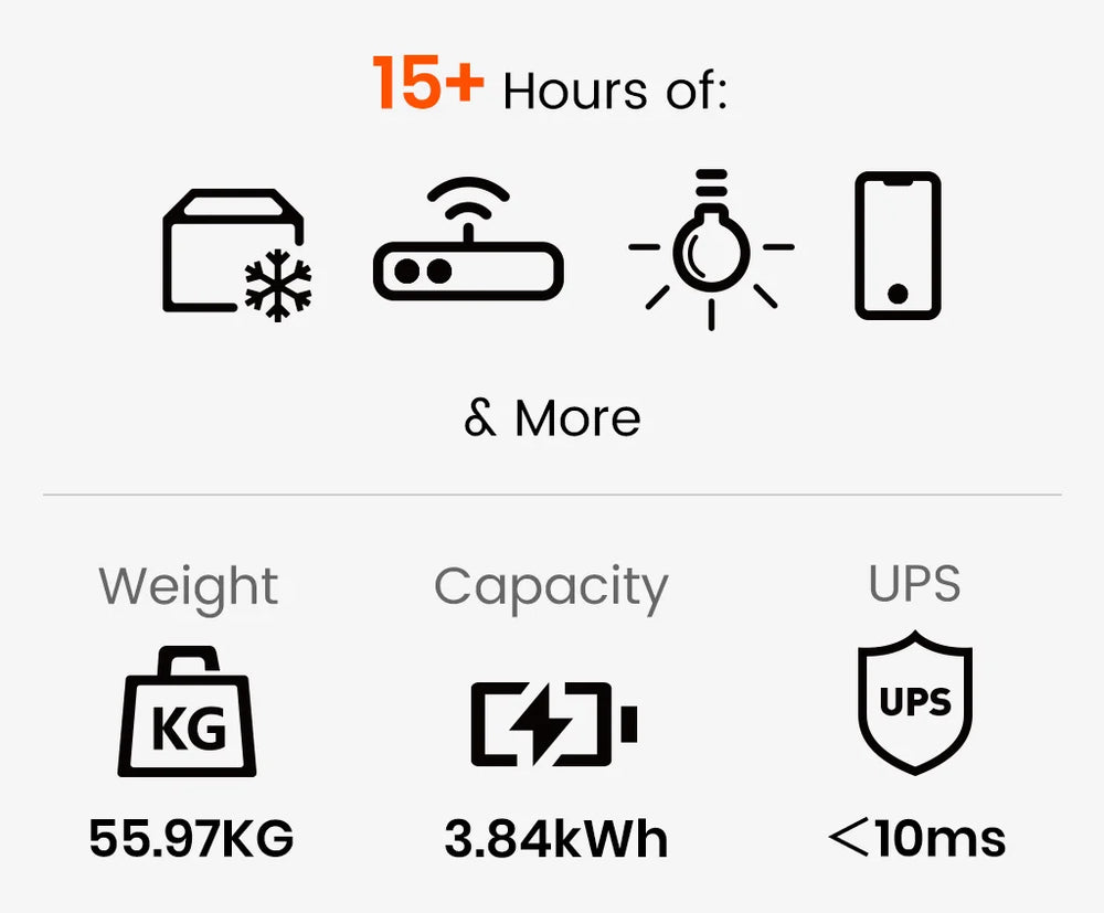 - 3840Wh Capacity & 3600W Continuous AC Output, Surge 7200W.