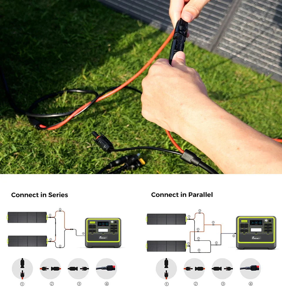 For connecting SP200 to F2400 portable power station, either in series or in parallel for 2 x 200W.