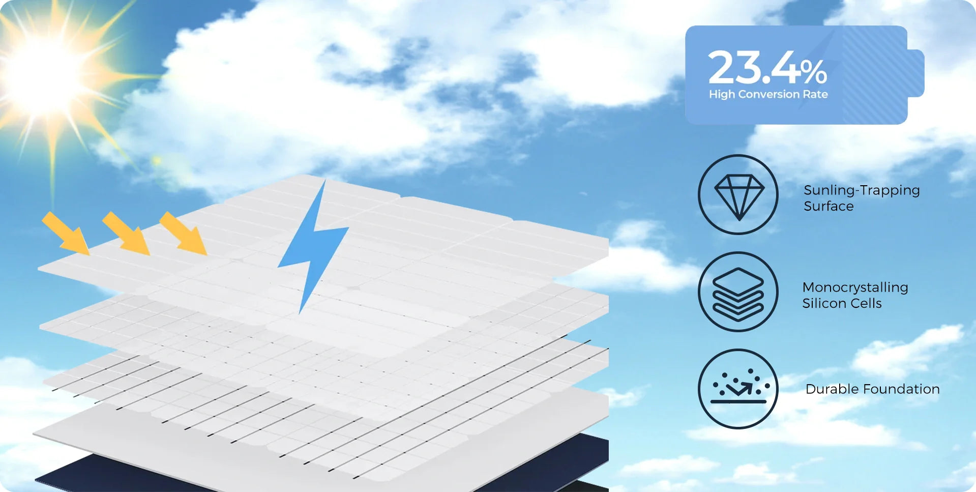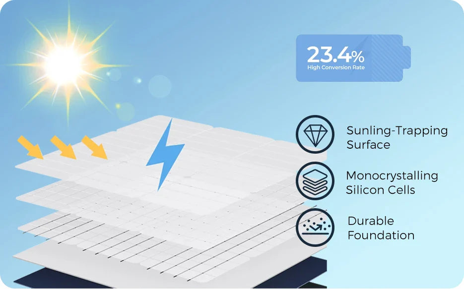 - 23.4% Conversion Efficiency – High solar conversion efficiency help you capture more sun and charge faster.